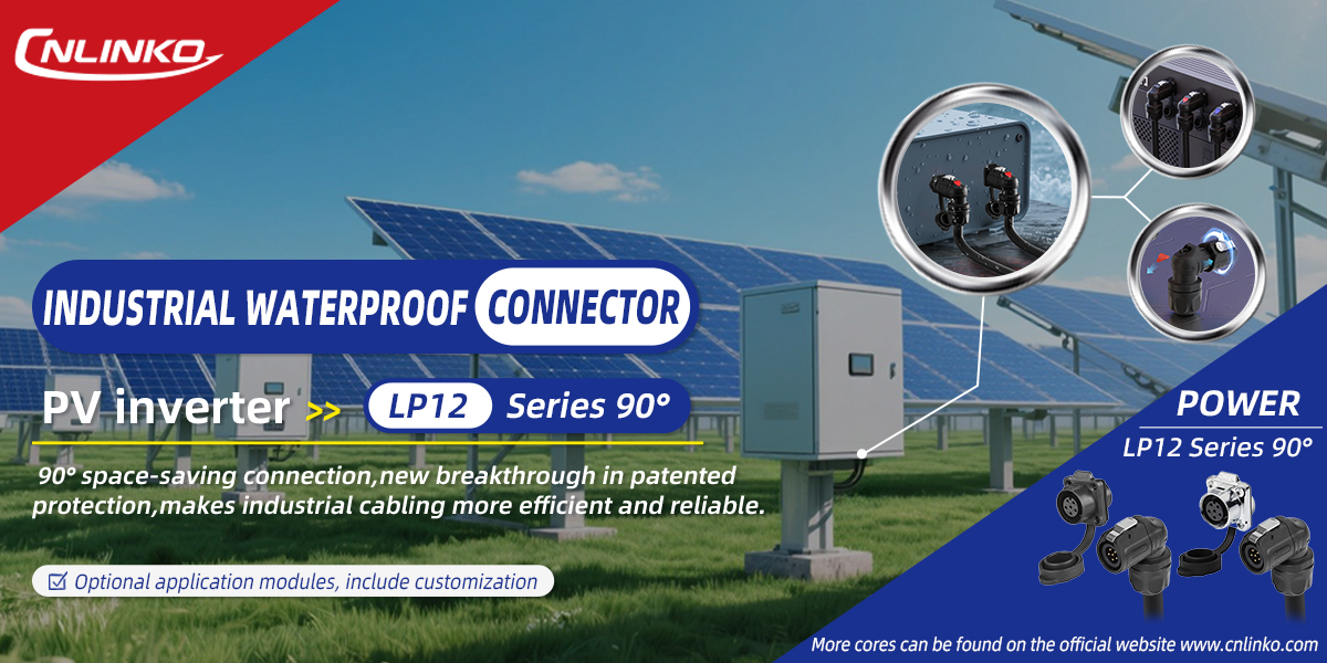 In solar PV systems, inverters convert DC electricity from solar panels into stable AC power for homes or grids. Connectors transmit power between panels, inverters, and grids/loads. CNLINKO's LP12 Series 90° industrial connector—featuring space-efficient design, IP68/IPX9K waterproofing, and quick installation—is gaining recognition in PV applications.
