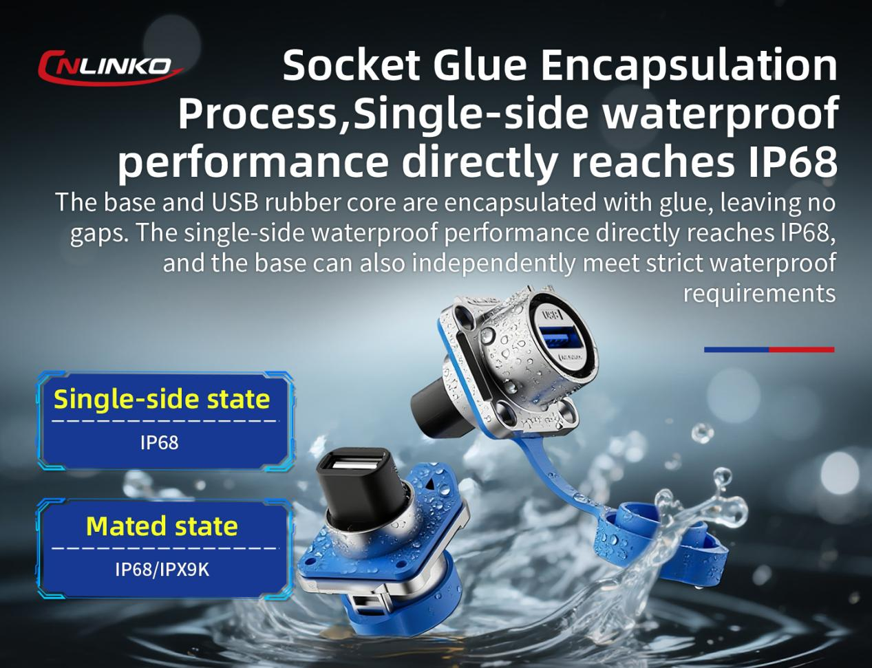 When the CNLINKO metal USB socket is used with its matching plug in the mated state, it provides IP68/IPX9K level protection, completely blocking the intrusion of surrounding metal dust and oily coolant. Furthermore, the socket alone achieves IP68 "single-sided water resistance," meaning the socket maintains high waterproof performance even when the plug is disconnected and the protective cap is not closed.